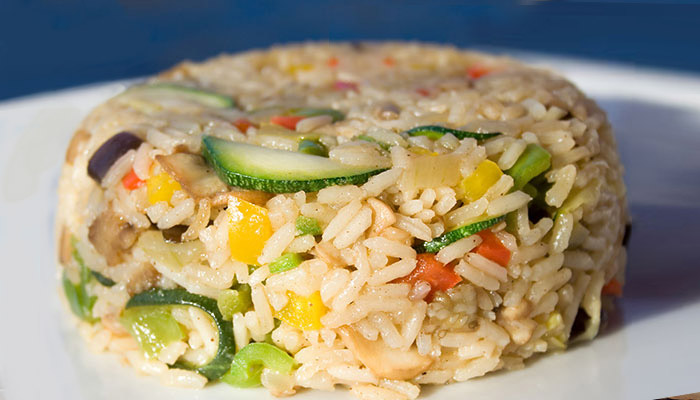 Ρίχνουμε το ρύζι να τηγανιστεί μαζί με τα λαχανικά για λίγο. Στη συνέχεια ρίχνουμε την ντομάτα ψιλοκομμένη.