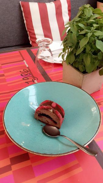 semifreddo με φυστίκι Αιγίνης και βύσσινο ή με μους μαστίχας. Κατά καιρούς υπάρχει