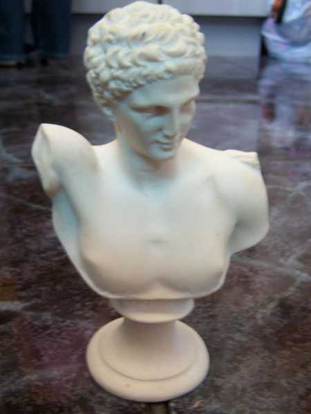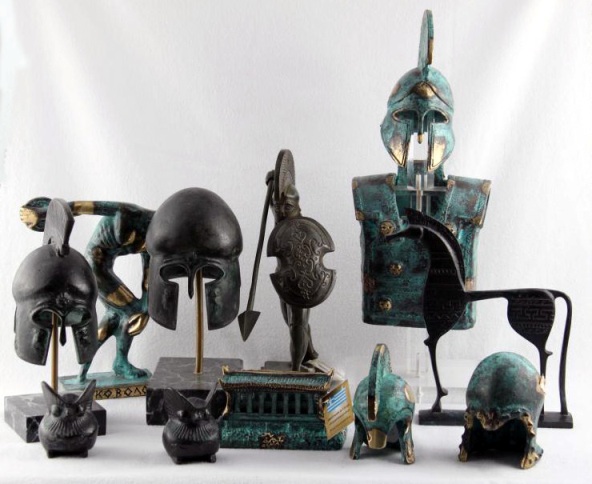 Small statues depicting warriors, armor, helmets, swords, athletes, and busts of famous ancient Greeks such as Pericles , Sophocles, Euripides, lovely items to give away or to keep for yourself.